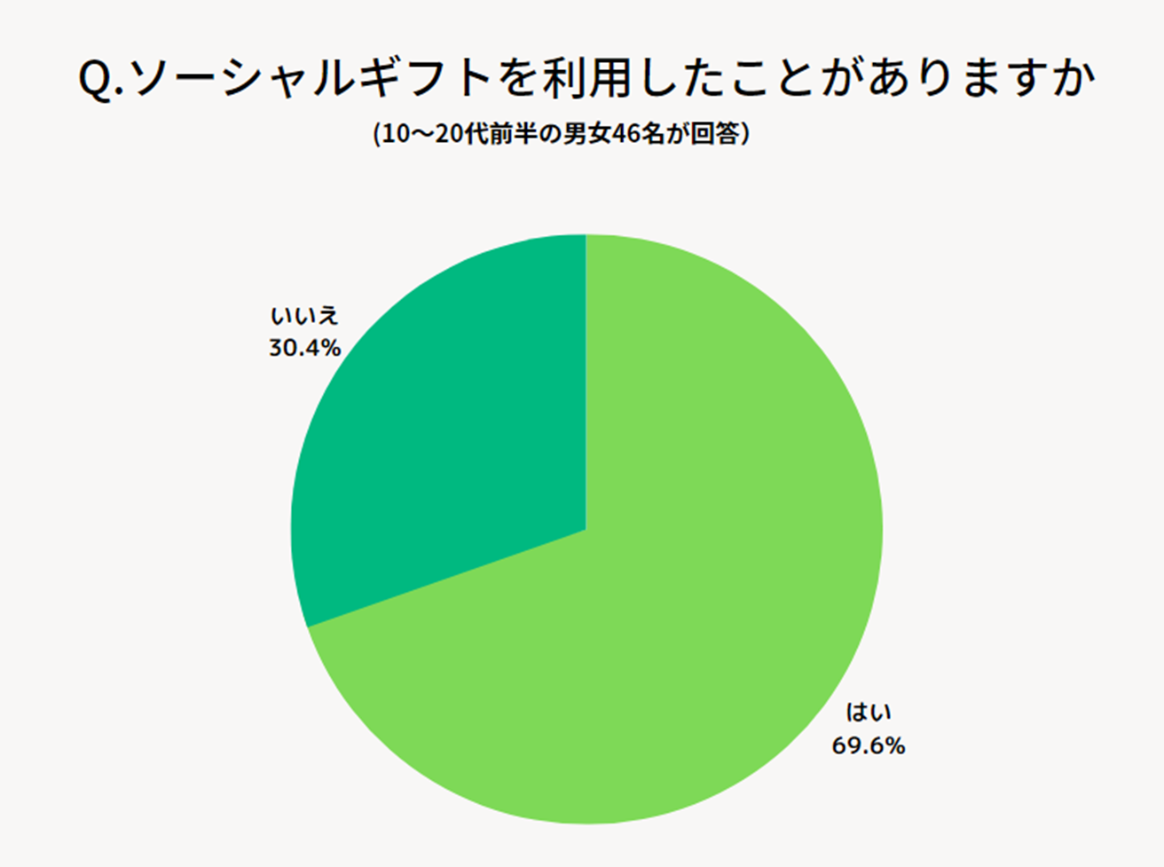 Z世代46人に、独自に聞いたアンケ―トにて、「ソーシャルギフトの利用」を聞いたところ、利用率は約7割という結果であり、さらには集計の男女比率も女性54.3%:男性45.7%とほぼ半々であったことから、男女ともに需要があり、ターゲット層は広くとれると考えられます。