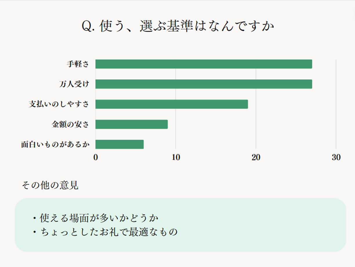 独自でZ世代に聞いたアンケートでは、選ばれる基準は「手軽さ」「誰に渡しても喜んでくれるもの」が選ばれる基準であることがわかりました。