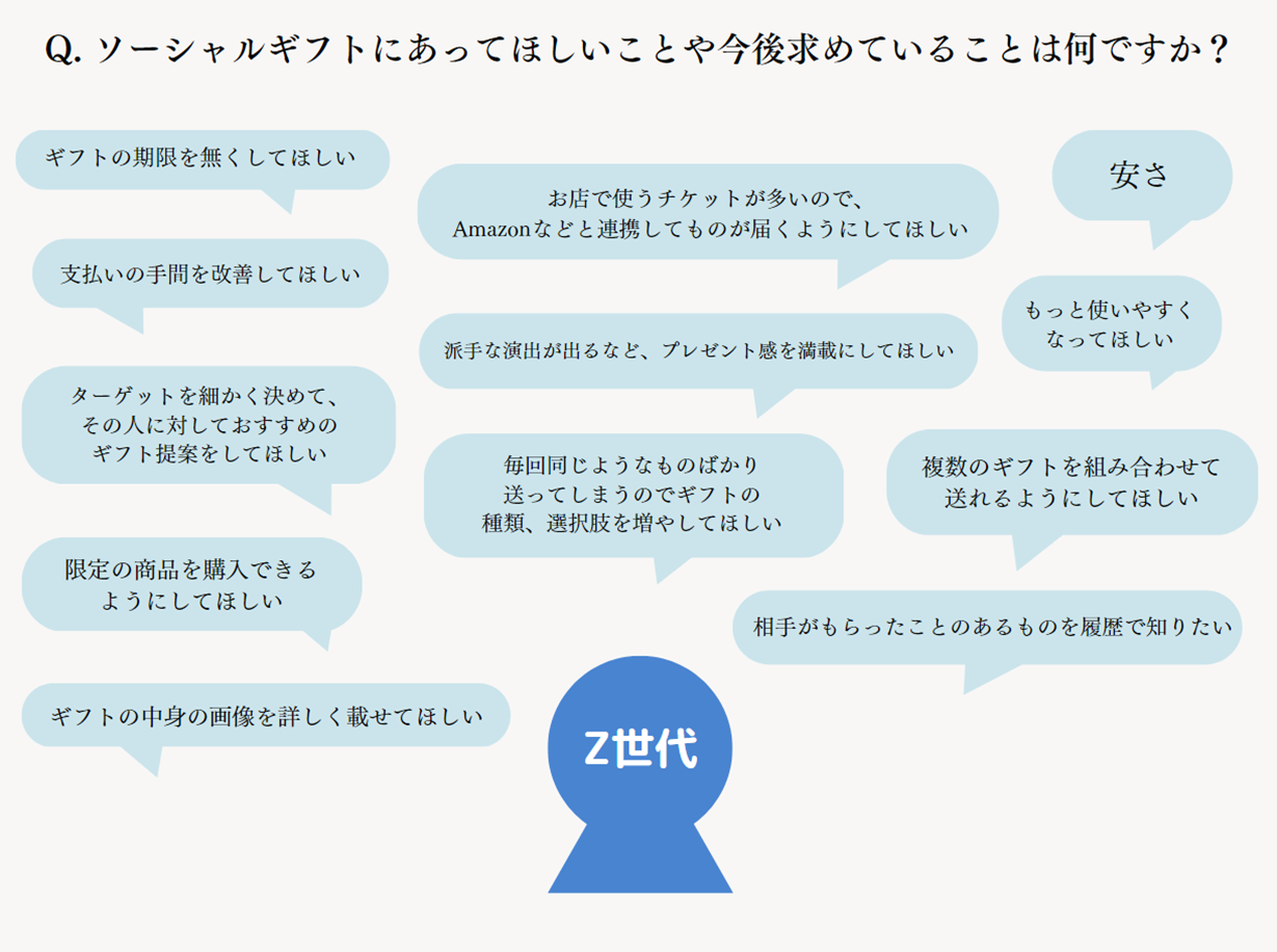 さらに、「ソーシャルギフトにあってほしいことや今後求めていること」について質問したところ、このような意見が出ました。