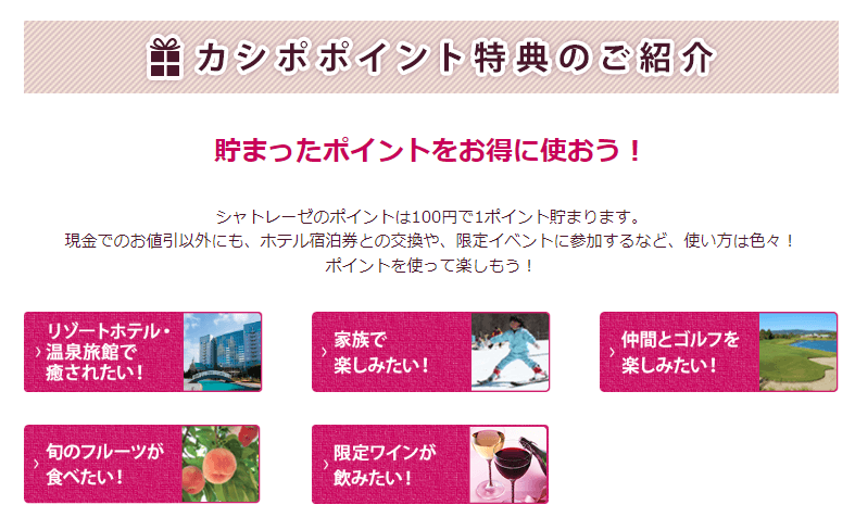 このカシポポイントは、商品購入の際に1ポイント1円の値引きに利用できるだけでなく、シャトレーゼグループの提供するリゾートホテルや温泉旅館への宿泊券(700pt〜)、スキー場の利用券(300pt〜)、ゴルフ場利用券(1500pt〜)やその他限定イベントなどの特典と交換することが可能です。