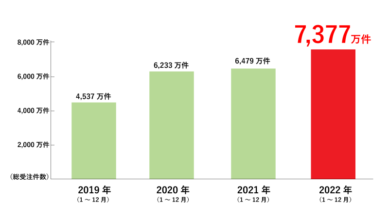 年間のecbeing全ユーザーの総受注件数は2019年が約4,537万件、2020年は約6,233万件、2021年は約6,479万件、2022年は約7,377万件と4年連続で年間流通総額に比例して増加しています。