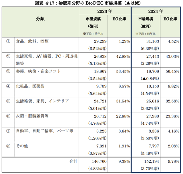 ネットスーパーを含む食品EC市場は、近年著しい成長を遂げています。経済産業省が2024年9月に発表した「令和5年度電子商取引に関する市場調査」によると、2024年の「食品、飲料、酒類」におけるBtoC-EC(消費者向けEC)の市場規模は3兆1,163億円に達しました。これは前年から6.36%の増加です。