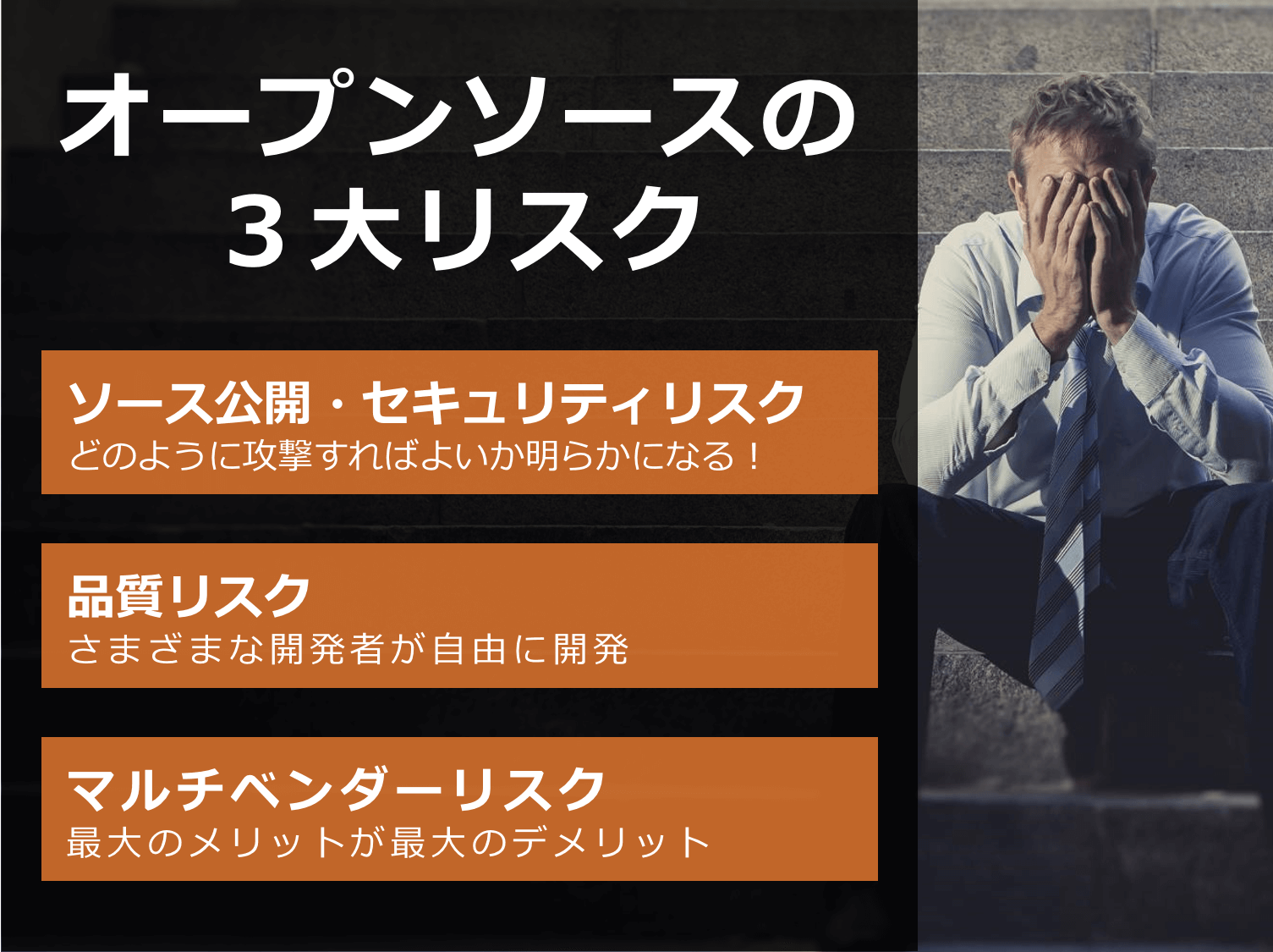 ・さまざまな開発者が自由に開発を行う為、致命的なバグやセキュリティホールが発生する割合が高い。
