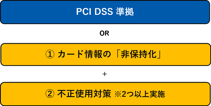 まず最初に「PCI DSSに準拠する」もしくは、「カード情報の非保持化をする」どちらかの対応が必要となります。