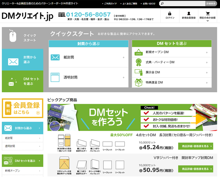 デザインから印刷、納品まで行う『小川印刷』は、オーダーの工程をわかりやすくしたECサイトデザインが特徴です。作りたい商品に簡単にアクセスできる「クイックスタート」や、オーダー後の実物イメージを容易に把握できるイラスト表示で、スムーズにオーダーできます。DM制作フローを文字だけでなく図で訴求することで、お客様の情報疲れを軽減するECサイトデザインです。