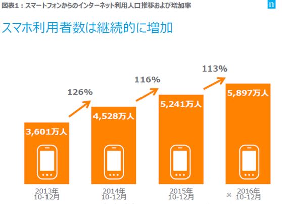 2016年もスマートフォンからのインターネット利用者は引き続き増加しており、2016年第4四半期(10月から12月)での平均利用者数は5,897万人で、前年同期と比べると約656万人増加しています。当然スマートフォンが多くなっているというのは皆様ご存知のとおりですが・・・。