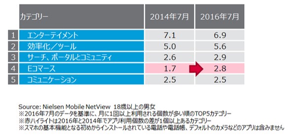 すべてのカテゴリーで微増となっているが、4位の「Eコマース」は1.2個増加し、唯一1個以上増加したカテゴリーとなり、ECアプリの利用率が急増しています。