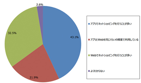 ネットショッピングの際に、Webとアプリのどちらを利用するかという調査では、43.1%の人が「アプリの方が多い」と回答し、32.5%の人が「Webの方が多い」と答えたようです。そうなるとスマホを使ってECを利用する場合には、Webよりもアプリでのネットショッピングが多いということですね。