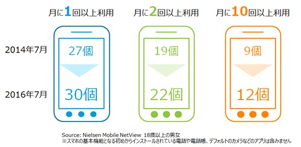 月に1回以上利用するアプリの個数は、2年前の27個から3個増加し30個となりました。また、月に2回以上利用するアプリは19個から22個、10回以上利用するアプリは9個から12個とそれぞれ3個ずつ利用数が増加しました。