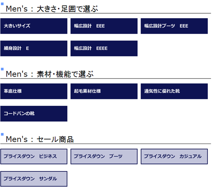 『REGAL, shoes street』は、さまざまな工夫を行い実店舗と同等のサービスを提供しています。ただチャネルを連携させるだけでなく、ユーザーのためになるコンテンツを補い快適に買い物できる環境を整えています。まずはECサイト上での商品の探しやすさについてご紹介します。