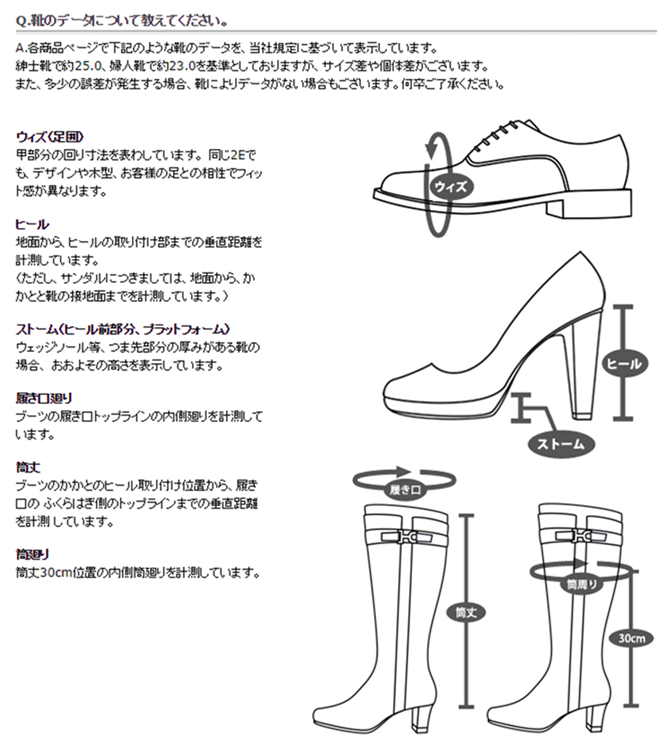 購入時重要な判断材料となる靴のデータに関しては、商品に応じて足囲や履き口の大きさなどまで細かく記載しています。ストームや筒丈など聞きなれない名称もありますが、該当箇所がわかるようにイラスト付きで説明されています。