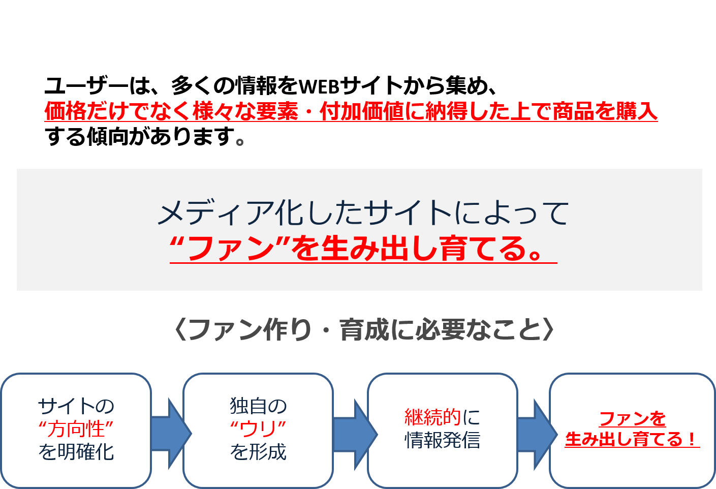 自社メディアやECサイトに訪問数を増やしたいという時に、上記の2つの点を意識する必要があります。特に近年はECサイトにおいて商品を並べて販売しているだけでは売れない時代になりました。これからはECサイトをメディアとして運営し、ファンを増やしていく取組が必要になってきます。