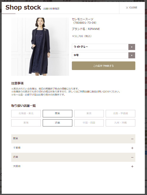 商品詳細の店舗在庫確認画面