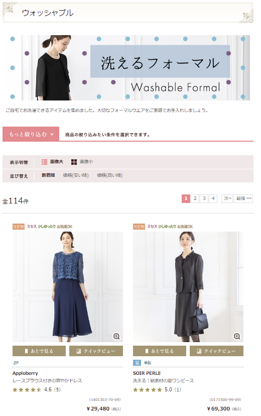 訴求に関して言うと、「たためて洗えるブラックフォーマル」というものを出しており、要はニット素材で畳んでポーチにしまってもシワになりづらく自宅で洗える商品にはなるのですが、弊社は10年以上前から「ウォッシャブルフォーマル」という言い方で販売していましたが、「洗える」という言葉を訴求として出すようにしたところお客様から「洗えるフォーマルなんてあるんですか?!」といったコメントも頂くほど、反響や購入にも繋がっています。
