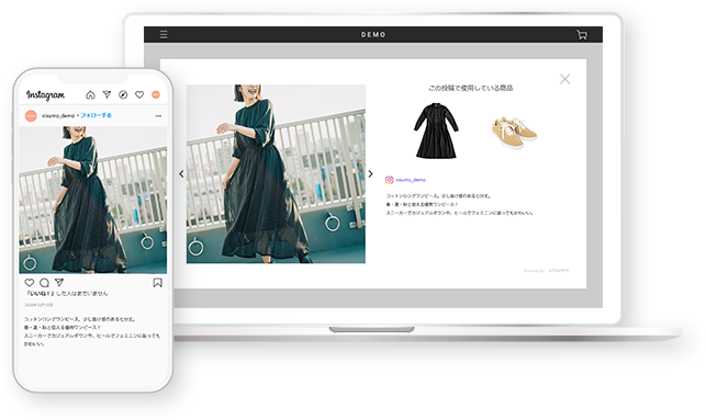 Instagram・Twitterのユーザー投稿、スタッフによるコーディネート例や接客コメント、LIVE配信動画やIGTV、Youtubeなどの動画などをECサイトに埋め込み、コンテンツを充実させることができるビジュアルマーケティングプラットフォーム。