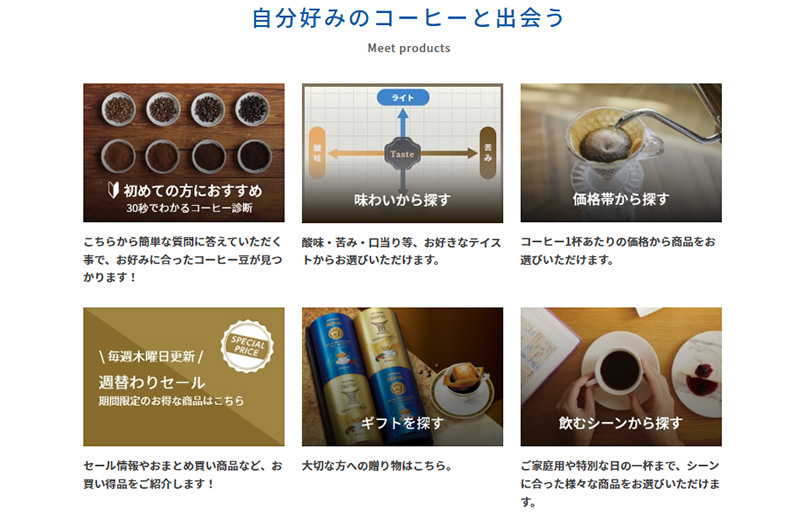 また、初めての方へ向けてコーヒー診断を設けたり、おすすめのコーヒーをチャート式で表示させたりするなど、お客様と商品の新たな出会いを創出する仕掛けもあります。
