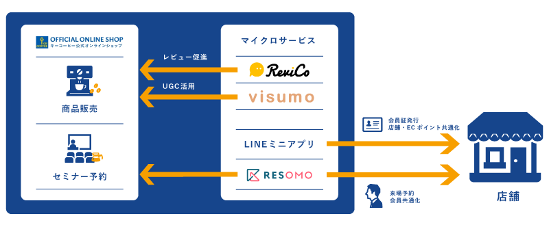 阿部氏:LTVを最大化するという使命のもと、キーコーヒーのファンを増やす方針で、ユーザーが横断的に弊社のサービスを使えるようにしていくために、複数のマイクロサービスを導入しました。ECサイトを土台に予約やユーザーレビューなど、全てがキーコーヒーのファンを作るための機能として使えるなと思い、現在も活用しています。