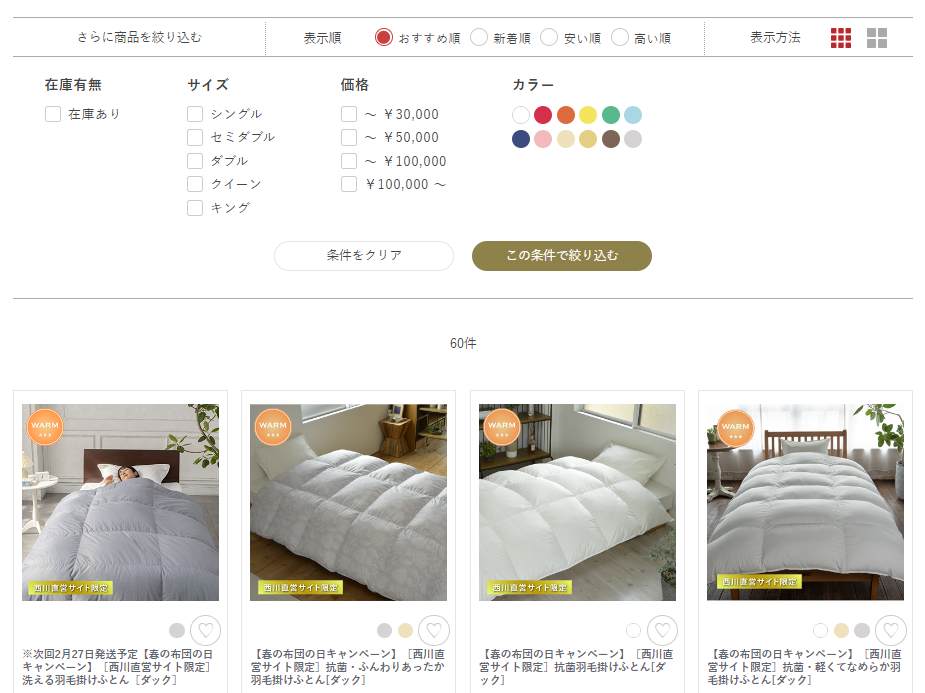 三浦氏:寝具でも様々な柄や色があるのですが、その時の住環境やお部屋の色に合わせて寝具を選ばれるということを考えた時に、需要の高さからカラーバリエーションでも商品をセグメントできるようにしています。