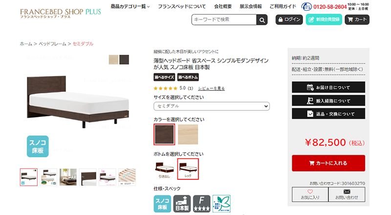 長谷川氏:ベッドフレームなどでは、1つのフレームに対して複数のボトム(脚)の組み合わせが存在します。特に電動ベッドとなるとリモコンやモーターの種類なども選ぶことができ、システム商品のようにとても複雑になっています。それらの組み合わせを個々に画像で表示すると、ほとんど同じような画像が並ぶ形になってしまい違いがわかりづらくなります。そのため、1商品の詳細ページ内で様々な組み合わせができるようにカスタマイズをおこないました。 ボトムだけでなく、色や機能、付属品の有無など簡単に組み合わせを変えることができ、選びやすくなっています。
