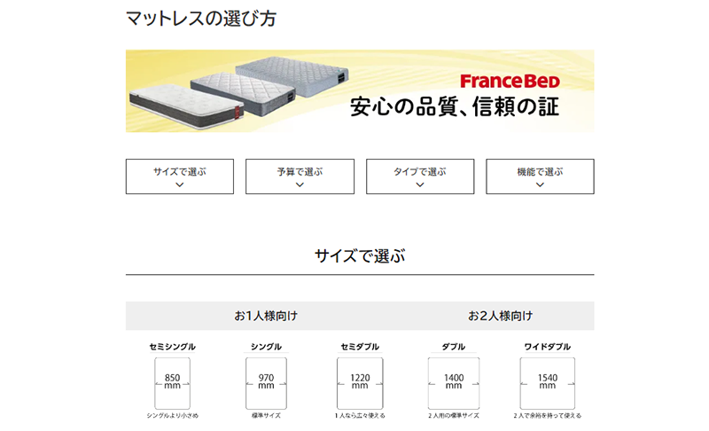長谷川氏:サイズなどのバリエーションが豊富なベッドやマットレスなどでは、お客様が迷われたときに少しでも後押しができるように“選び方”のページを作成しています。実際の大きさを数字で表記したり、予算の範囲で該当する商品を表示したりするなど、絞り込み機能にはこだわっています。実際、このページは多くの方に見ていただき活用されています。