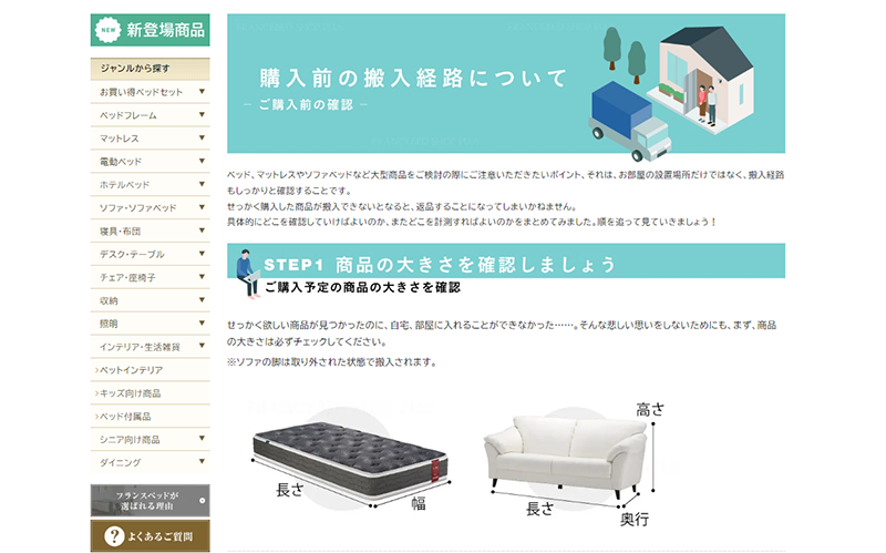 長谷川氏:ベッドのような大型商品を買ったけど家や部屋に入らない、となるとせっかく購入したのに返品になってしまいかねません。そうならないために、購入前に注意していただきたいポイントを記載したページを作成しています。「こういう形の家で入らなかった」という結果を配送業者から聞き、その時の形状をピックアップして特徴を掲載しています。たまたま同じような形状の家に住んでいるスタッフがいましたので家の写真を撮ってきてもらい、その写真をもとに詳しい説明もしています。社内に設計ができる者もいるので、過去に家具が入らなかった事例を具体的な図で書いてもらい反映させています。