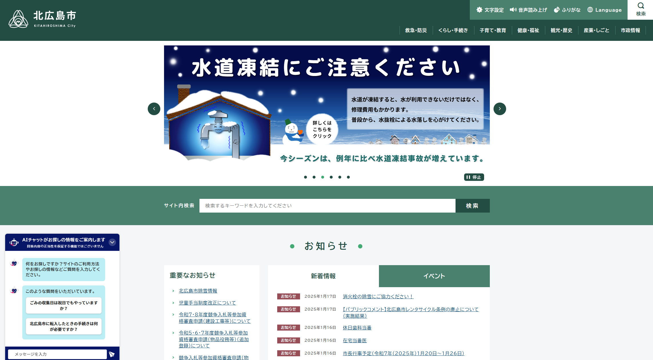 北広島市役所 公式HPにAIチャットボット導入し効率的に市民へ情報発信