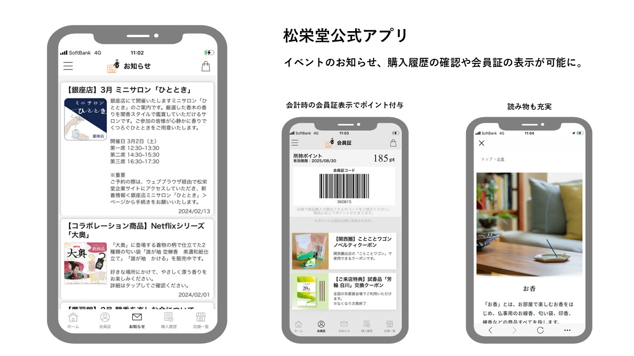アプリでは店舗・ECにおける新商品の登場、イベントのお知らせなどを確認することができます。実際に、季節に合わせたおすすめの香りを試せる「香りにであう会」や厳選した香木を聞香スタイルで聞くことができるミニサロン「ひととき」などリアルで開催するイベントへの案内・お知らせをおこない、イベントへ足を運ぶお客様も多くなっています。