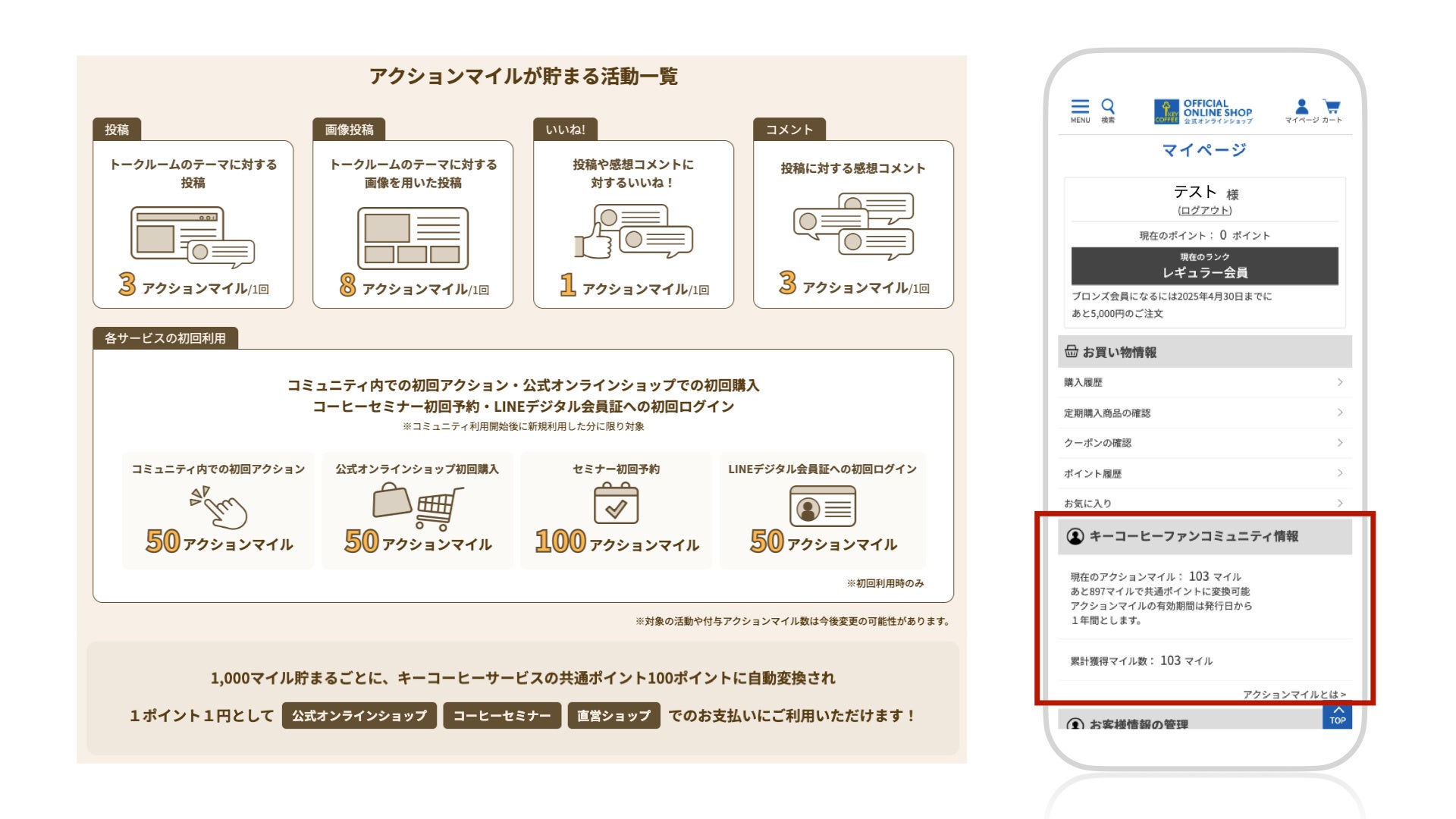 また、アクションマイルは一定数貯まると「キーコーヒー公式オンラインショップ」「コーヒーセミナー」「LINEデジタル会員証」で使える共通ポイントに自動的に変換されるため、お客様のコミュニティサイト内の活動を促進することも期待できます。