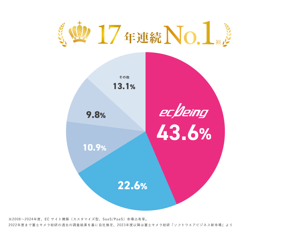 2024年度ecbeingはECサイト構築カスタマイズ型SaaS/PaaS市場のシェア43.6%※1を記録しました。これにより、ecbeingはECサイト構築市場17年連続シェアNo.1※1となりました。