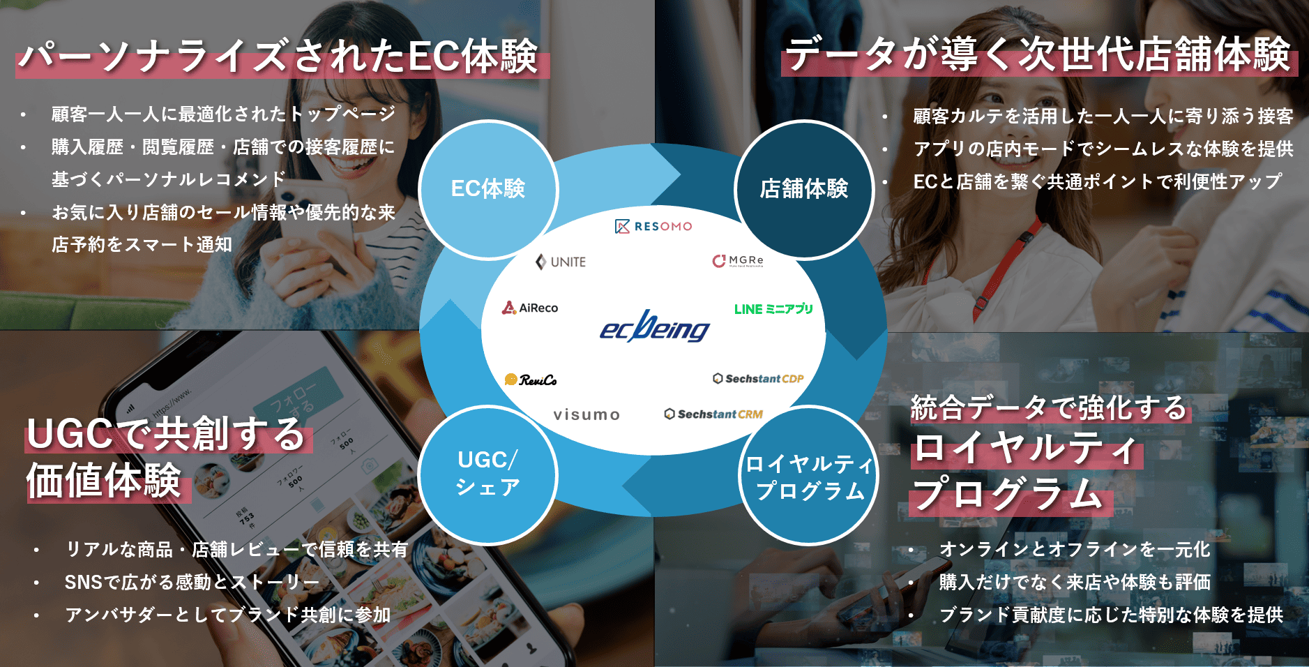 ただECを構築するだけでなく、顧客ロイヤリティをあげる「ファンマーケティング」、顧客を引き付ける魅力的なコンテンツを発信する「メディアコマース」、会員データを活用した店舗連携やアプリ等の複数の接点で最適な購買体験を提供する「オムニチャネル」など、お客様のEビジネスに合わせたサービスの提供を可能としています。