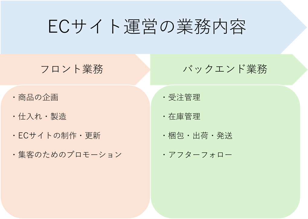 ECサイト運営は、大きく「フロント業務」と「バックエンド業務」という2つの業務に分けることができます。この2つの業務はそれぞれ別の専門知識が求められることから、大規模な企業の場合は別の部署が担当することがほとんどです。それぞれの業務内容は以下の通りです。