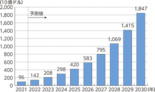 世界のAI市場規模(売上高)は、年々成長していていますが、その後も2030年まで加速度的成長が予測されています。
