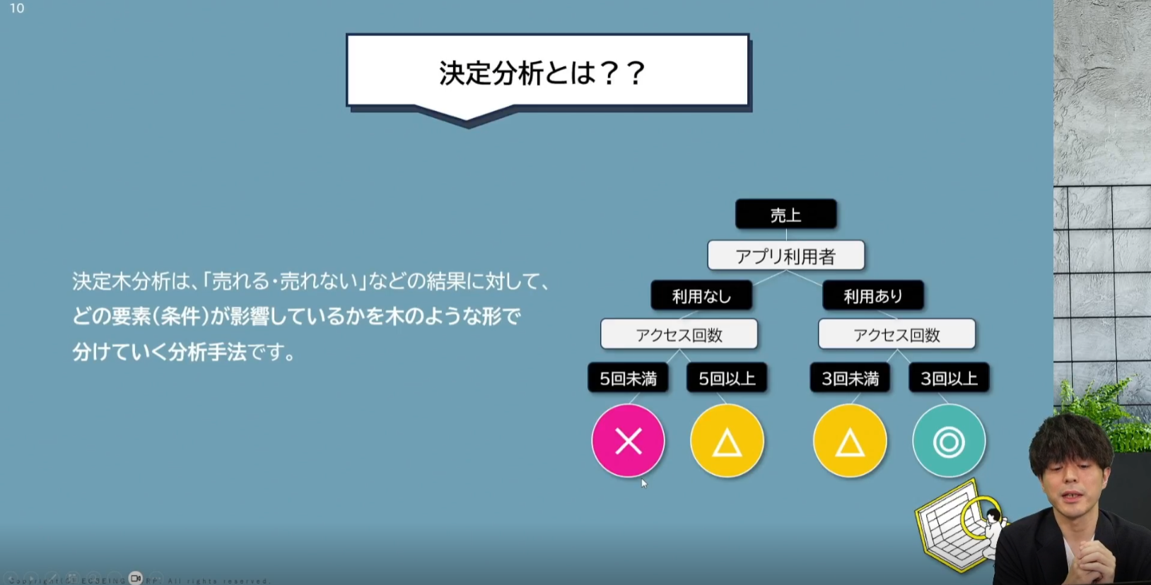 決定木分析とは、AIを活用して膨大なデータを階層的に分類し、特定の目的(例:売上向上、継続率改善など)に寄与する要素を視覚的に明らかにする手法です。