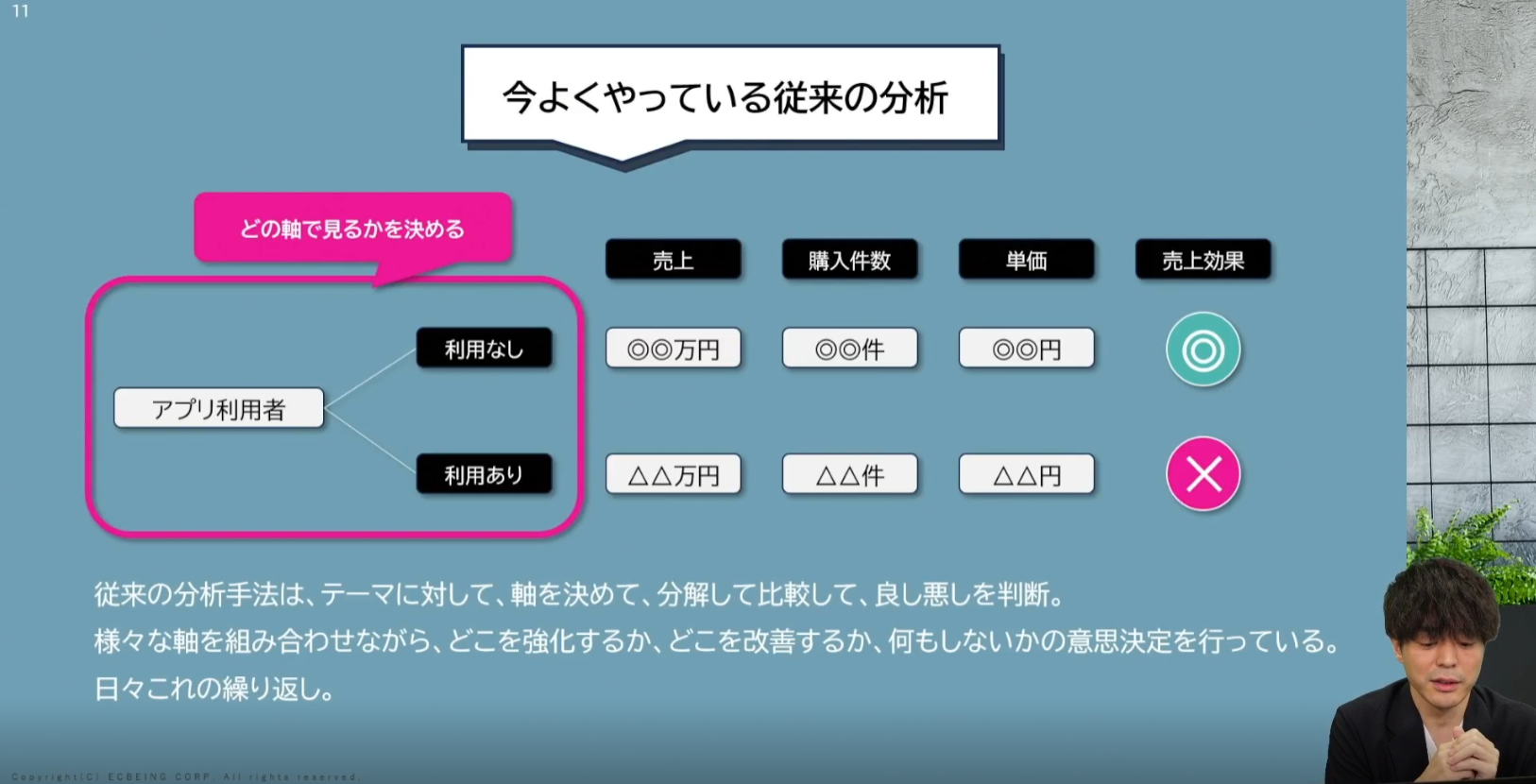 従来のデータ分析では、テーマごとに軸を設定し、手動でデータを分解・比較して善し悪しを判断する方法が一般的でした。 しかし、近年ではデータの種類や量が増加し、これまでの分析手法では時間がかかりすぎる上に、全体像を把握するのが難しくなっています。そこで、決定木分析が新しい切り口として注目されています。