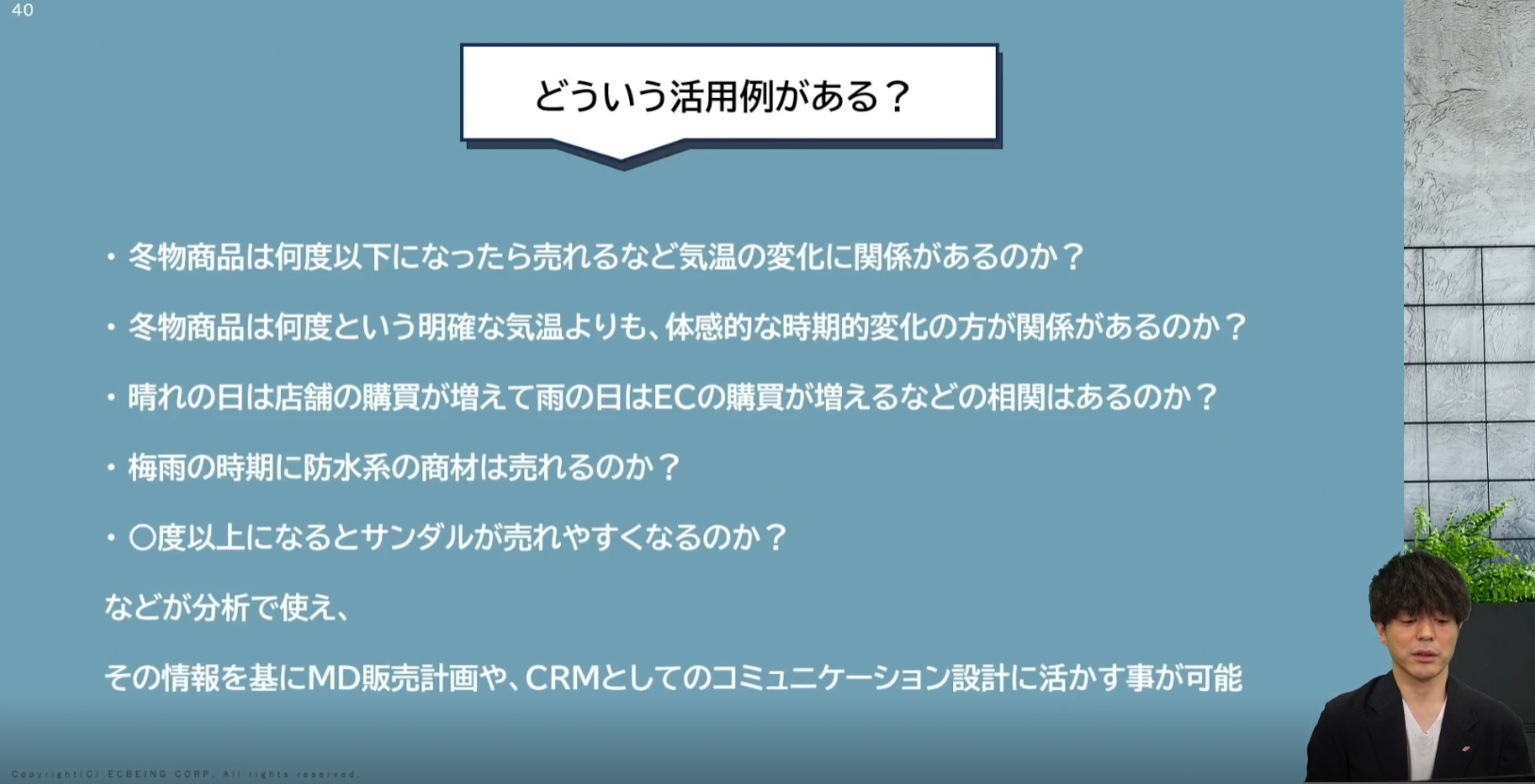 アパレル業界では、気温が一定のラインを下回るタイミングで、冬物商材を重点的にプロモーションする施策が効果を上げています。また、化粧品業界では、雨の日にECでの購買が増加する傾向を活用し、雨の日限定の割引キャンペーンを展開することで売上アップを実現しています。