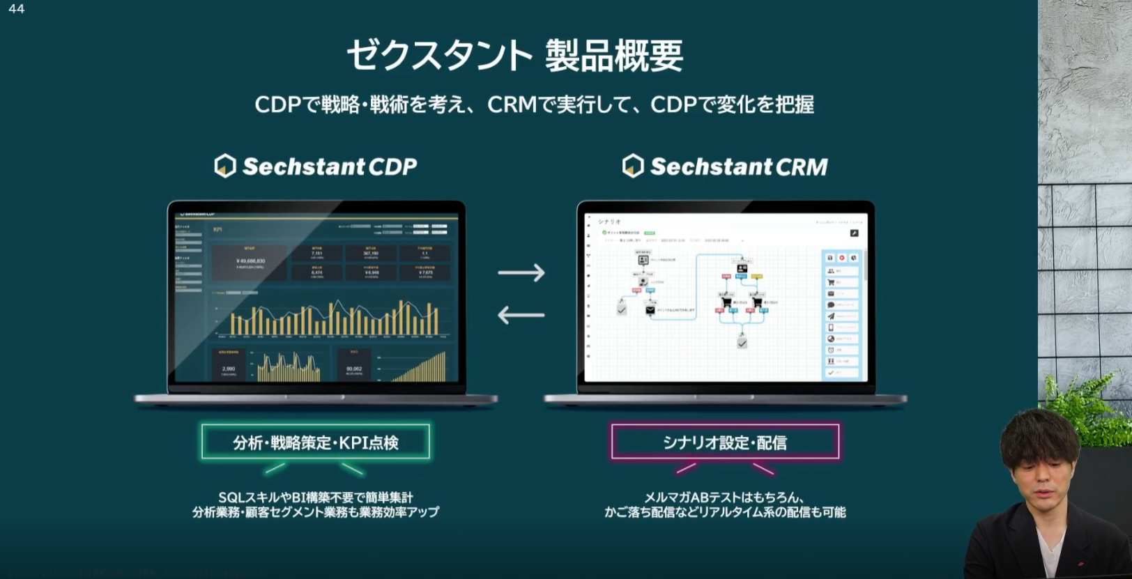 株式会社ecbeingが提供する「Secstant(ゼクスタント)」というツールは、CDP(カスタマーデータプラットフォーム)とCRM(顧客関係管理ツール)を組み合わせたソリューションです。このツールを利用することで、データの一元管理から施策の実行までを効率的に行えます。